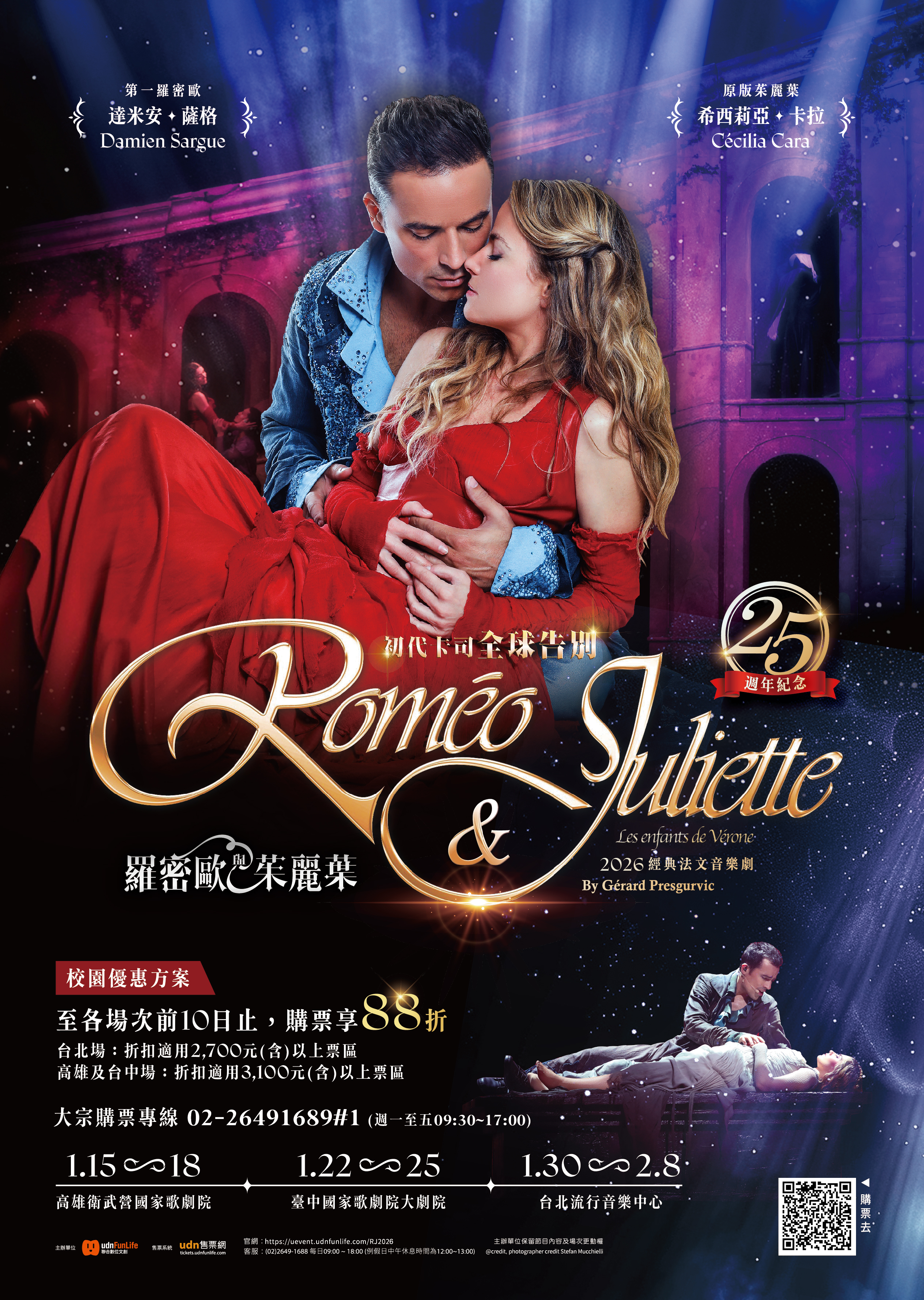 | 一、 | 經典法文音樂劇《羅密歐與茱麗葉》自2001年在巴黎首演即轟動全球,以磅礴動人的音樂、現代感十足的編舞與都市巴洛克風格美學,重新詮釋莎士比亞經典悲劇,劇中更以紅與藍兩大色系象徵家族對峙,展現強烈視覺張力;而初代卡司的演出早已成為大眾心中難以取代的記憶,本次適逢音樂劇25周年同時也是初代卡司告別巡演,讓這次在台灣的演出更具紀念性。法文音樂劇以獨樹一格的「演唱會」形式製作打造,特別強調「音樂」與「演員魅力」,以「歌」帶「戲」是法式音樂劇製作的順序與模式,藉由歌曲詠唱以及雋永詞彙的表達,再加上多樣化背景音樂襯托,讓演員的情緒起伏及情感傳遞更加深刻。誠摯推薦師生前來觀賞國際級精彩演出,並藉此增進對各類表演類型的了解。 |