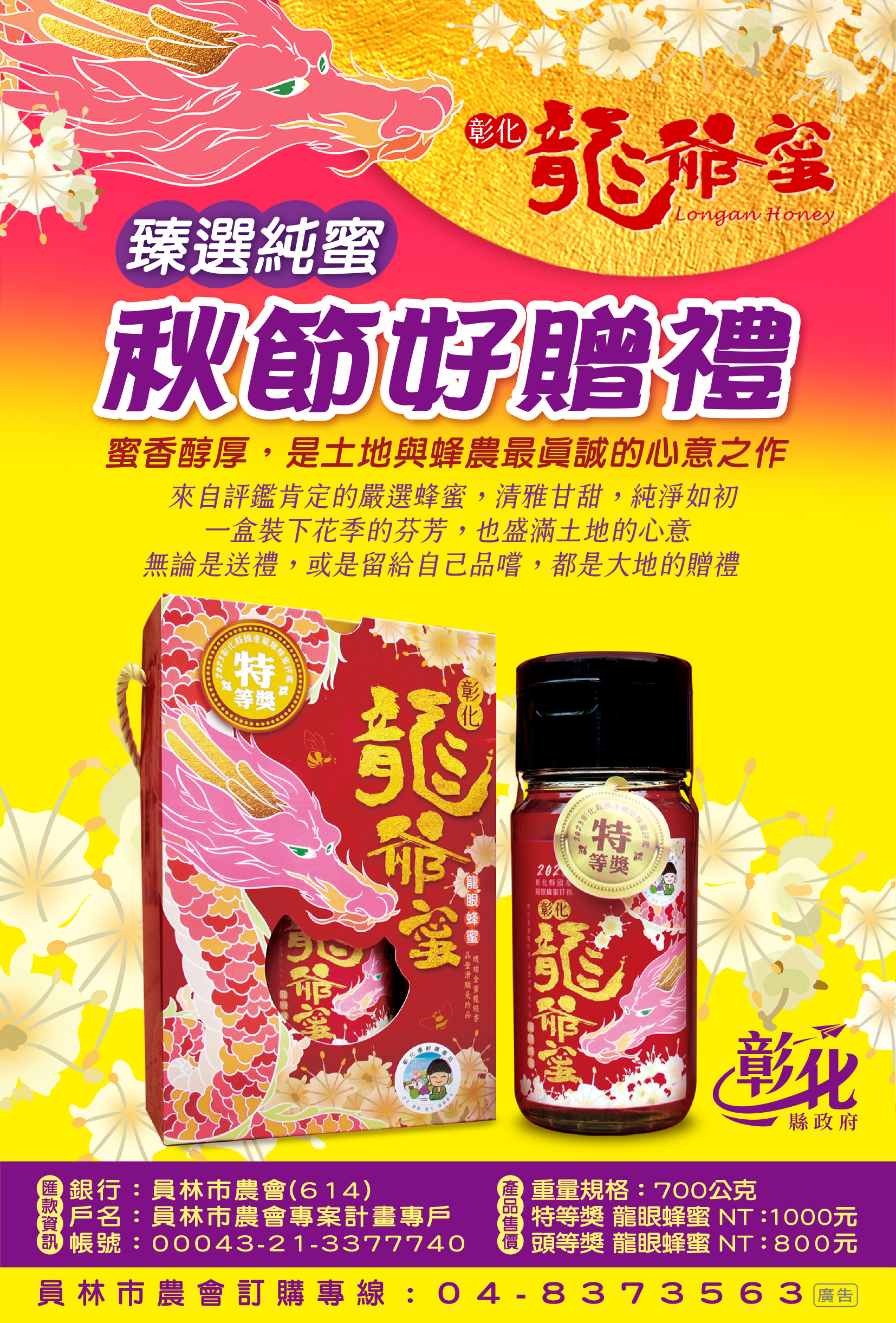 二、 | 本縣114年度『龍爺蜜』國產龍眼蜂蜜品質評鑑競賽,依據無抗生素及農藥殘留者檢測及色澤、香氣、風味嚴謹評選,蜂蜜品質純正有保障,且一桶得獎蜂蜜只能分裝400瓶,數量有限。 |