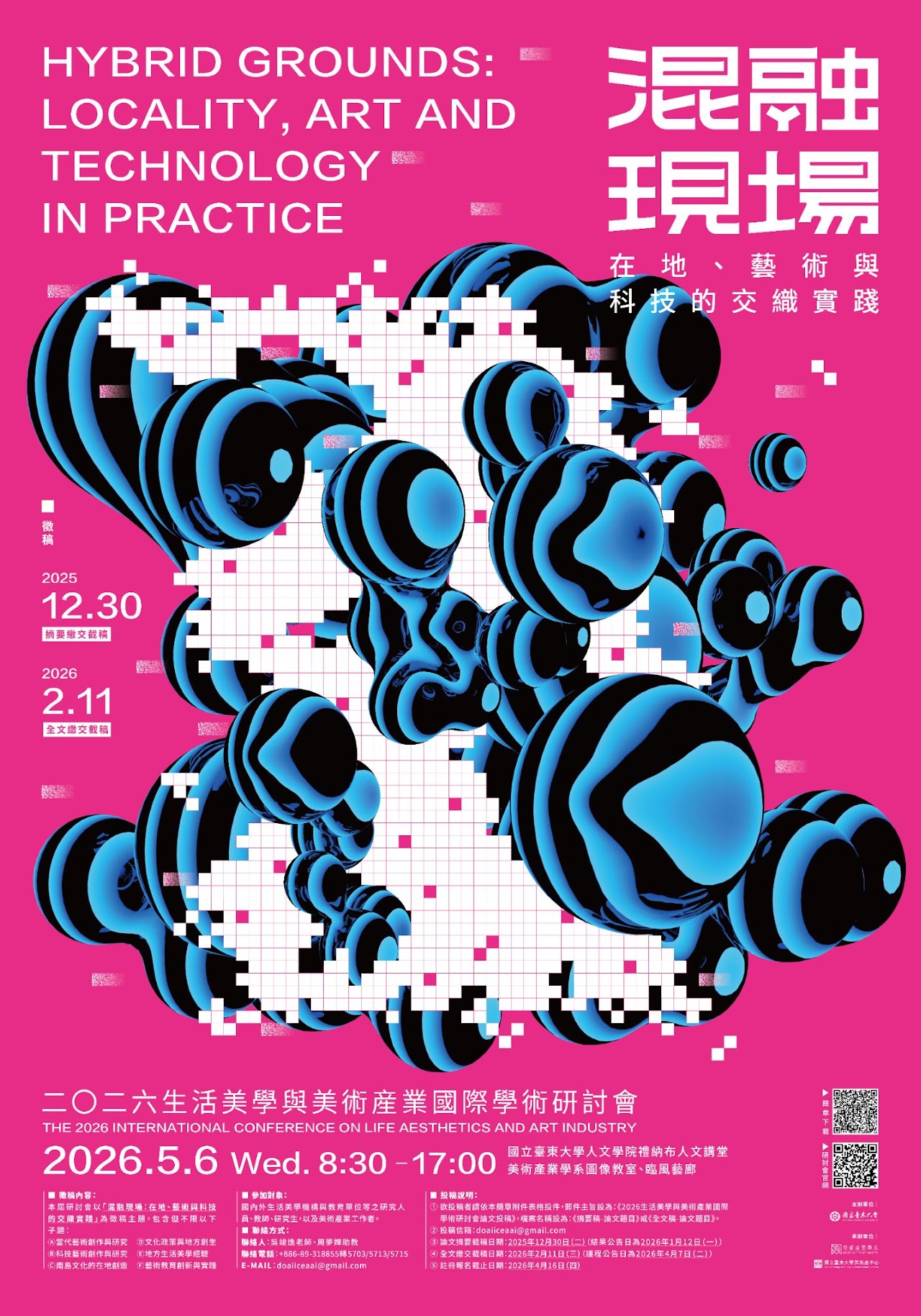 | 二、 | 為推展與提供國際化之學術交流平台,國立臺東大學謹訂於115年5月6日舉辦 「2026生活美學與美術產業國際學術研討會」,邀請各相關領域之專家學者與先進、各科系(所)之教師、研究生踴躍參與論文投稿,共襄盛舉。 |